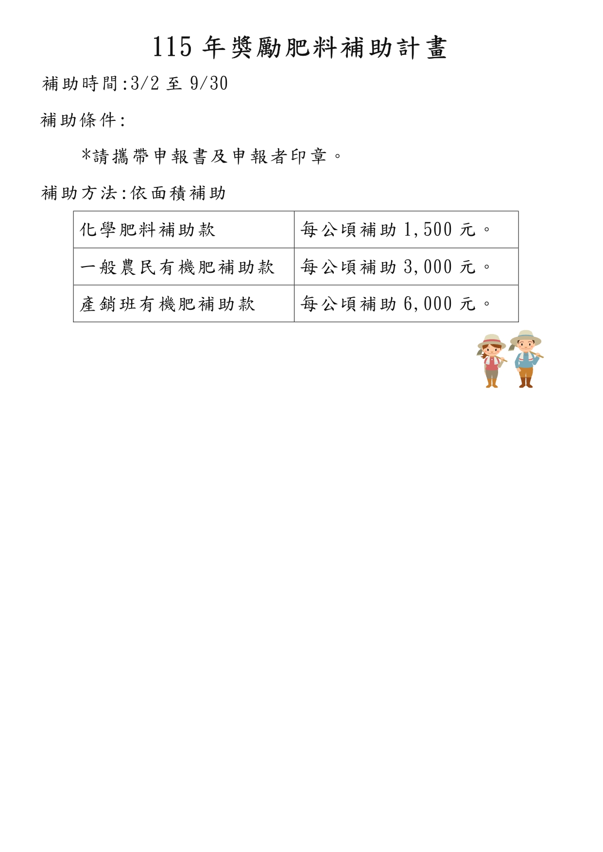 - 3辦理肥料補助:化學肥料每公頃補助1,500元、有機肥補助每公頃補助3,000元,補助比例1/2。